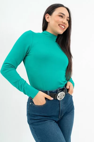 női vékony magas nyakú felső - rugalmas anyagból - szűk fazon - fémcímkével díszítve