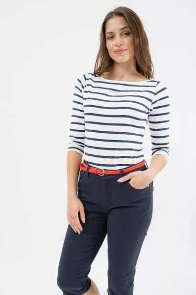 női capri nadrág szövött anyagból push-up fazon - normál derékmagasság - derekában keskeny, fonott övvel - fémcímkével díszítve<br> <br> <p>