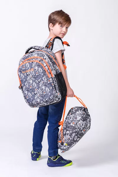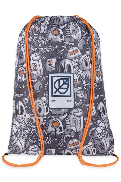 32x44 cm. Egyrekeszes tornazsák. Alapanyaga vízlepergető. Robotos mintával.