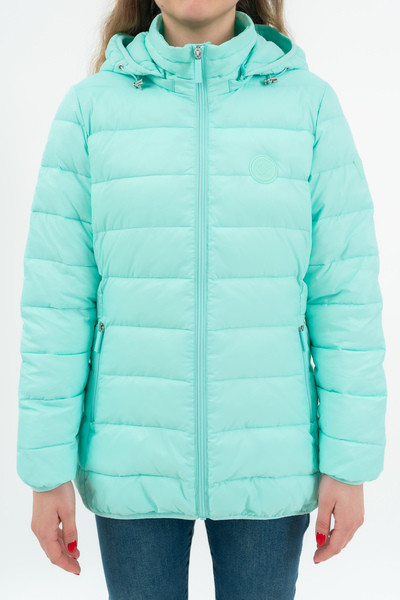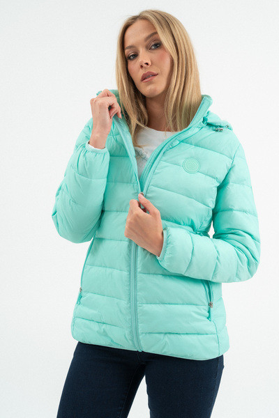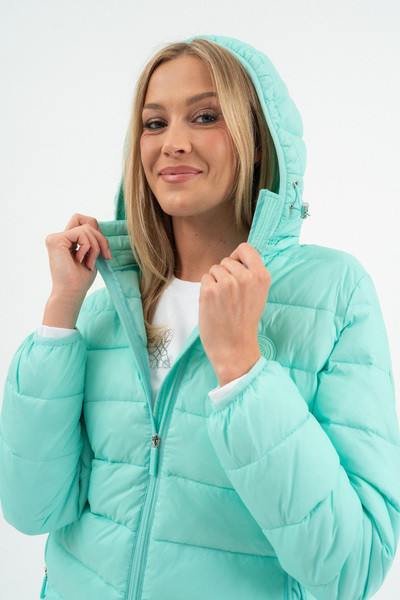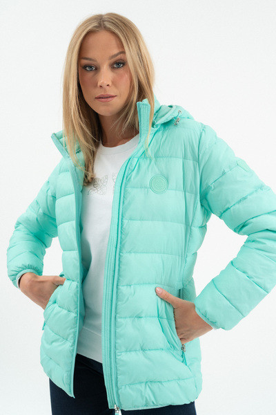 Női steppelt vékony dzseki .Enyhén karcsúsított fazon.Kapucni lecipzározható.Belső zsebek.Gumicímkékkel díszítve.