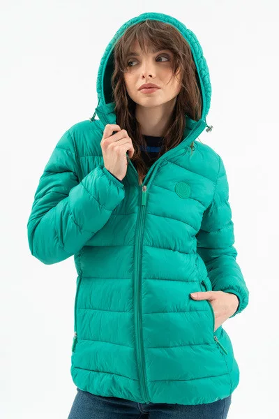 Női steppelt vékony dzseki .Enyhén karcsúsított fazon.Kapucni lecipzározható.Belső zsebek.Gumicímkékkel díszítve.
