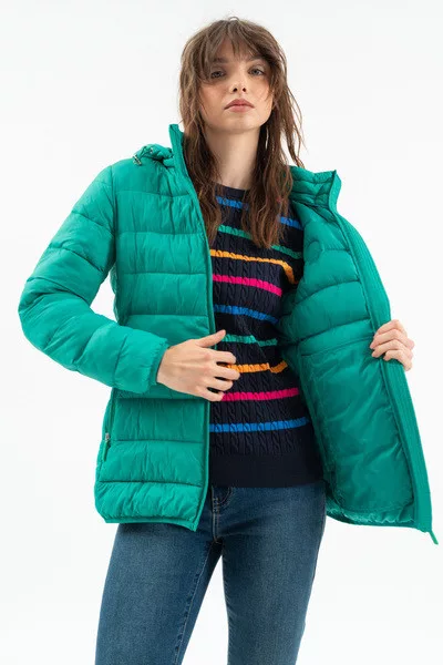 Női steppelt vékony dzseki .Enyhén karcsúsított fazon.Kapucni lecipzározható.Belső zsebek.Gumicímkékkel díszítve.