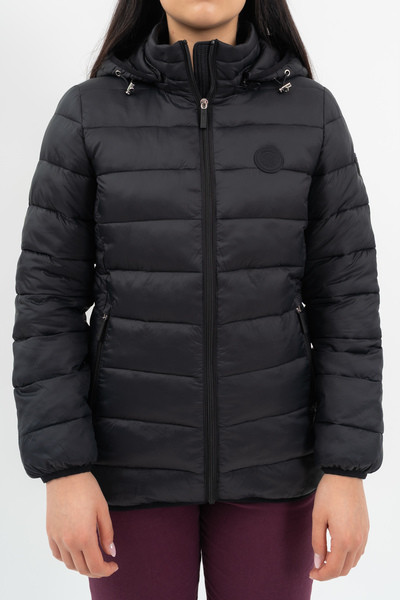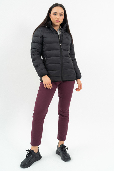 Női steppelt vékony dzseki .Enyhén karcsúsított fazon.Kapucni lecipzározható.Belső zsebek.Gumicímkékkel díszítve.