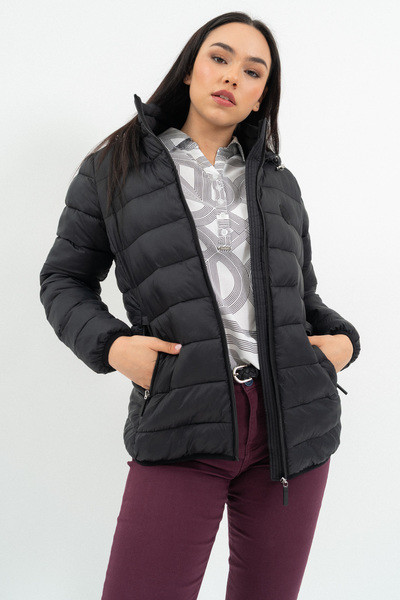 Női steppelt vékony dzseki .Enyhén karcsúsított fazon.Kapucni lecipzározható.Belső zsebek.Gumicímkékkel díszítve.