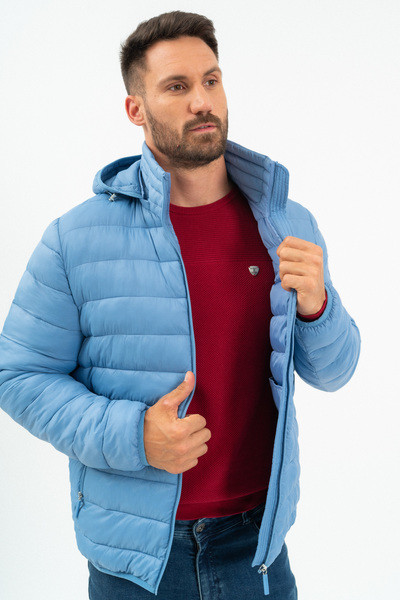 Férfi steppelt vékony dzseki .Kapucni lecipzározható.Belső zsebek.Gumicímkékkel díszítve.