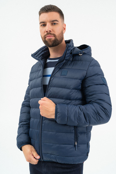 Férfi steppelt vékony dzseki .Kapucni lecipzározható.Belső zsebek.Gumicímkékkel díszítve.