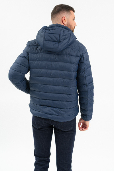 Férfi steppelt vékony dzseki .Kapucni lecipzározható.Belső zsebek.Gumicímkékkel díszítve.