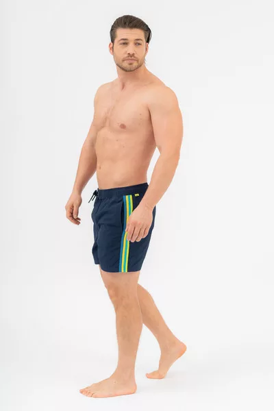 Férfi beach short. Hálós belső nadrággal. Szövött címkével díszítve. Mindkét oldalán zsebek. Hátul egyik oldalán tépőzáras zseb. A hátsó zseben vízkivezető lyukak.
