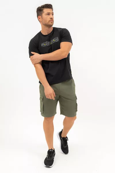 Férfi oldalzsebes short . Alapanyaga belül bolyhozatlan . Szövött címkével díszítve.