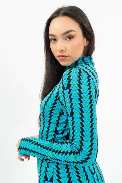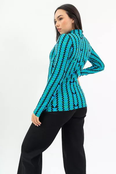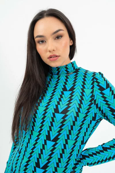 Női vékony magas nyakú felső . Rugalmas anyagból. Szűk fazon. Fémcímkével díszítve.