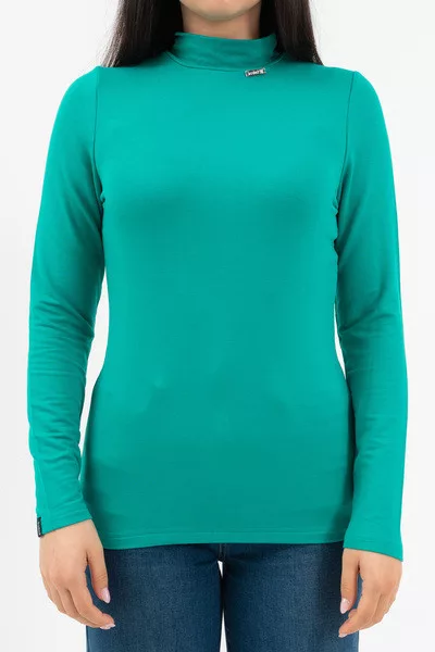 Női vékony magas nyakú felső . Rugalmas anyagból. Szűk fazon. Fémcímkével díszítve.