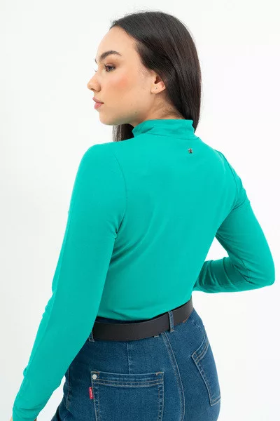 Női vékony magas nyakú felső . Rugalmas anyagból. Szűk fazon. Fémcímkével díszítve.