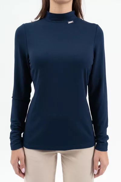 Női vékony magas nyakú felső . Rugalmas anyagból. Szűk fazon. Fémcímkével díszítve.