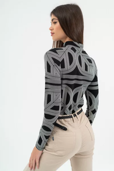 Női vékony magas nyakú felső . Rugalmas anyagból. Szűk fazon. Fémcímkével díszítve. FIGYELEM! A nagyméretű nyomott minták egyedileg kerülnek rá minden termékre, így az elhelyezkedésük eltérő lehet a fotón látottól!.