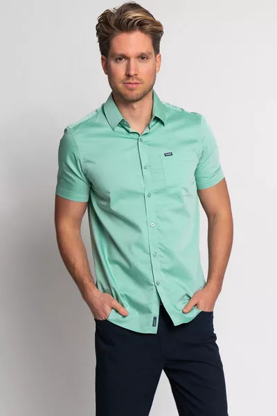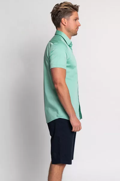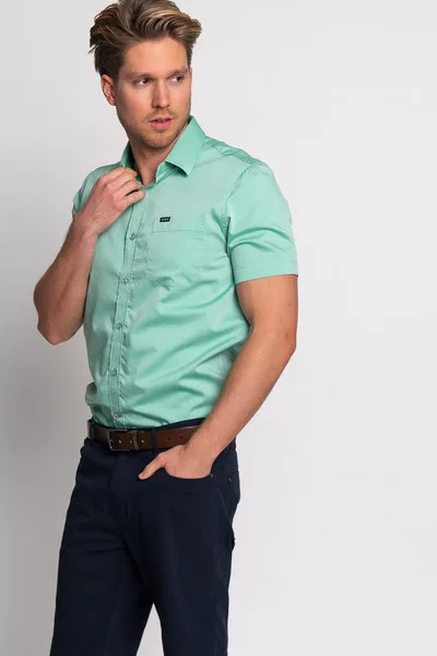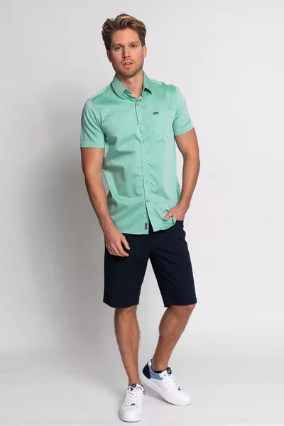 Regular fit rövid ujjú férfi ing. Egyenes szabású. Kényelmes, jól szellőző anyagból. Szövött címkével díszített.