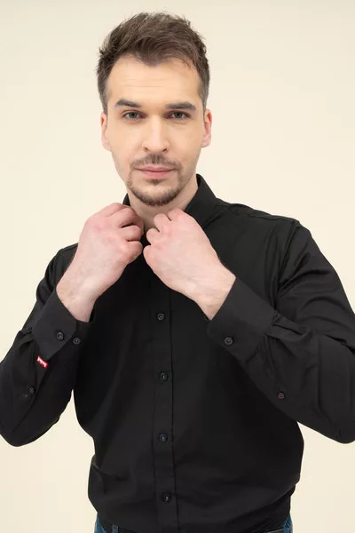 Férfi ing rugalmas anyagból. Slim fit- szűkített fazon. Hímzéssel és szövött címkével díszítve.