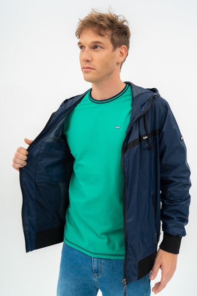 Férfi kapucnis dzseki . Belső zsebek. Gumicímkével díszítve.