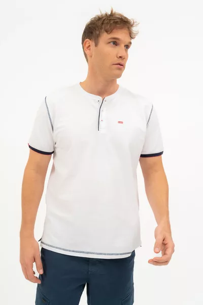 Regular fit férfi póló rugalmas piké anyagból. Nyomott mintával és szövött címkével díszített.