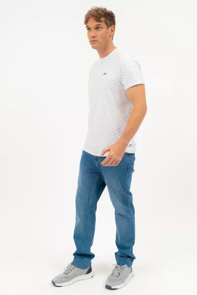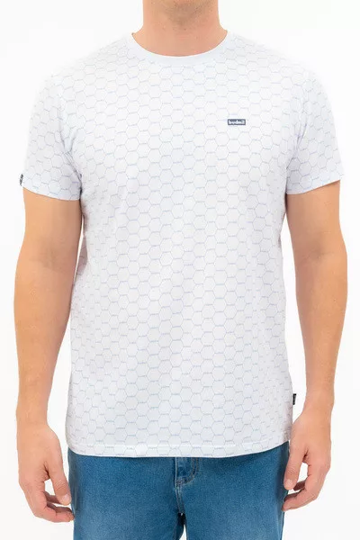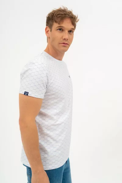 Modern fit férfi póló rugalmas anyagból. Nyomott mintával és szövött címkével díszített.