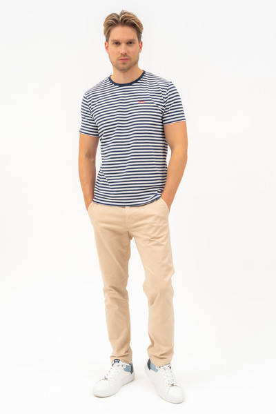 Modern fit férfi póló rugalmas anyagból. Nyomott mintával és szövött címkével díszített.