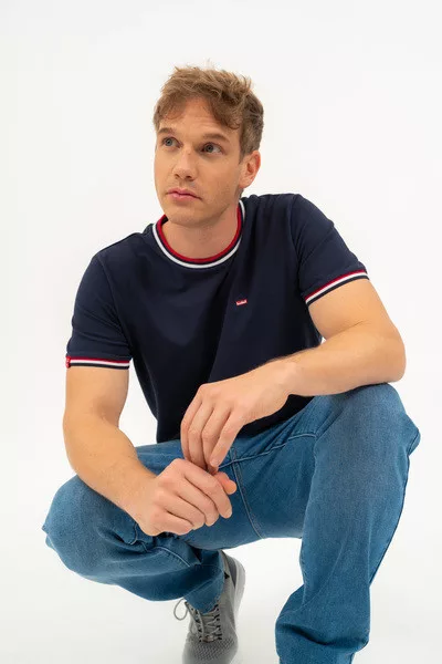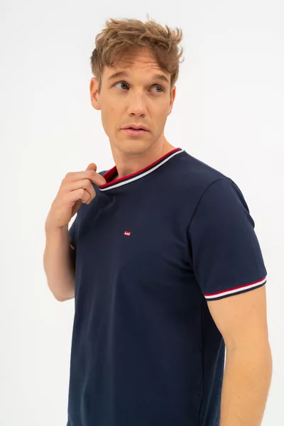 Modern fit férfi póló rugalmas piké anyagból. Nyomott mintával és szövött címkével díszített.