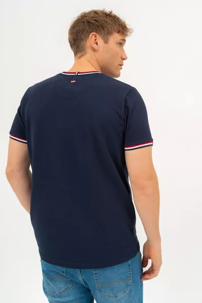 Modern fit férfi póló rugalmas piké anyagból. Nyomott mintával és szövött címkével díszített.