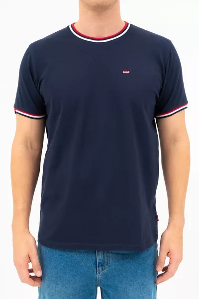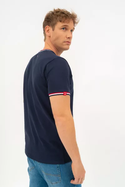 Modern fit férfi póló rugalmas piké anyagból. Nyomott mintával és szövött címkével díszített.