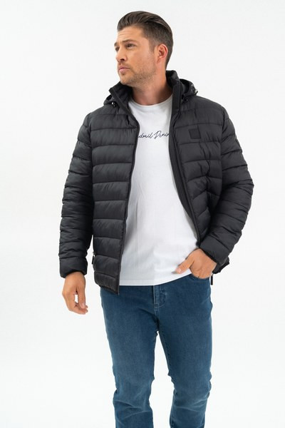 férfi steppelt vékony dzseki - kapucni lecipzározható - belső zsebek - gumicímkékkel díszítve