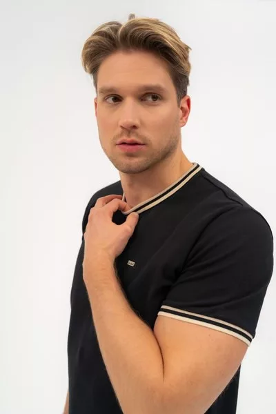 modern fit férfi póló rugalmas piké anyagból - nyomott mintával és szövött címkével díszített