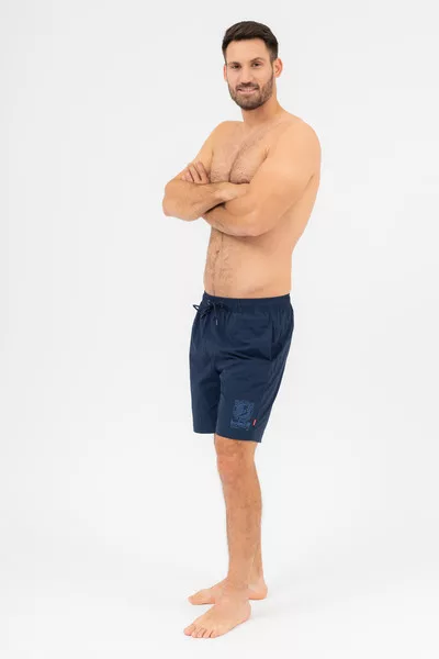 Férfi beach short. Hálós belső nadrággal. Nyomott mintával díszítve. Mindkét oldalán zsebek. Hátul egyik oldalán tépőzáras zseb.