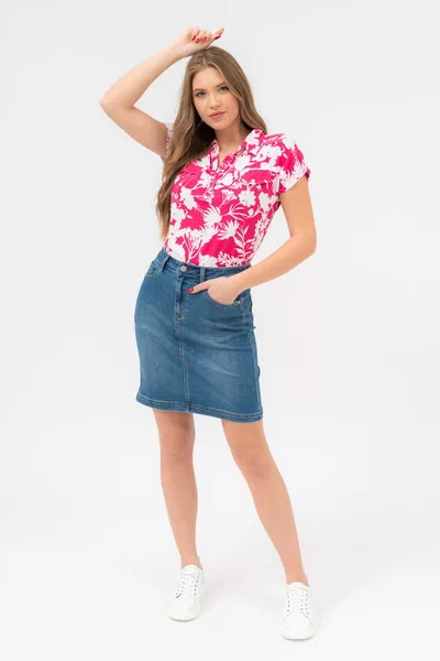 Rövid ujjú női blúz. Karcsúsított fazon. Fémcímkével díszítve.