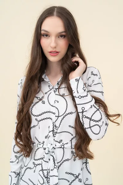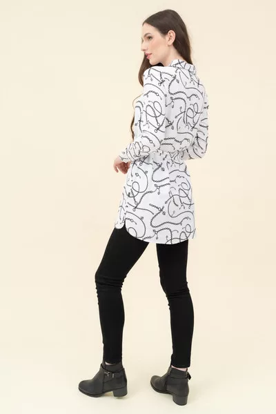 Női hosszított blúz . Lezser fazon. Derekán öv. Fémcímkével díszítve.