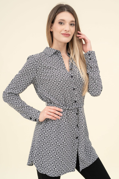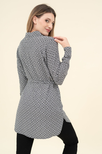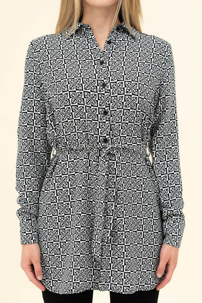 Női hosszított blúz . Lezser fazon. Derekán öv. Fémcímkével díszítve.