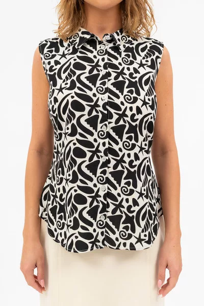 Ujjatlan női blúz . Karcsúsított fazon . Fémcímkével díszítve.