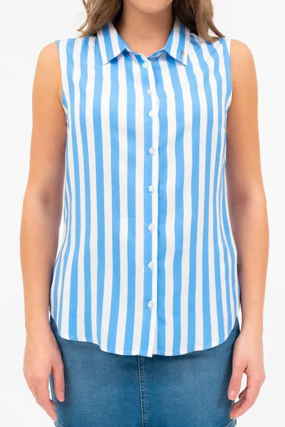 Ujjatlan női blúz . Karcsúsított fazon . Fémcímkével díszítve.