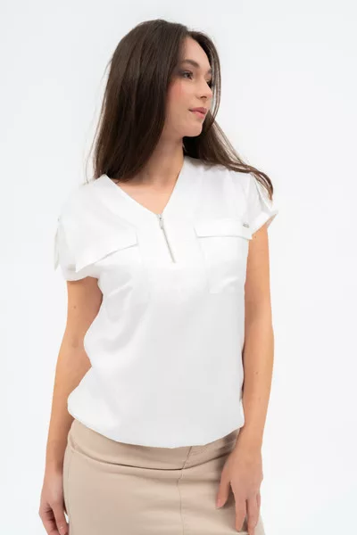 Rövid ujjú női blúz . Lezser fazon . Alján gumírozott. Fémcímkével díszítve.