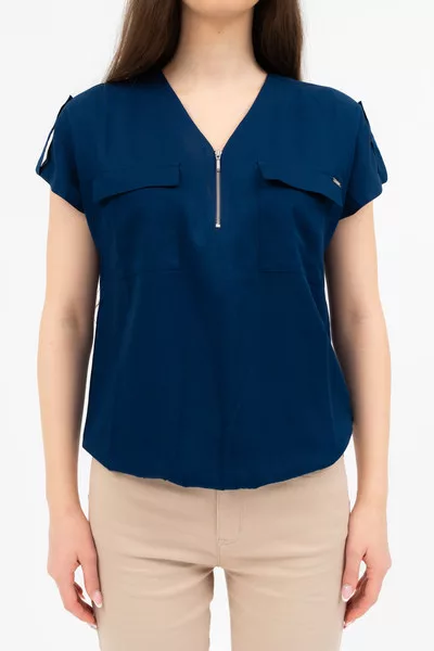 Rövid ujjú női blúz . Lezser fazon . Alján gumírozott. Fémcímkével díszítve.