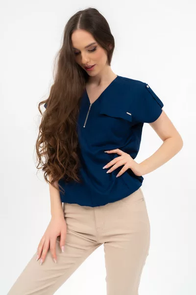 Rövid ujjú női blúz . Lezser fazon . Alján gumírozott. Fémcímkével díszítve.
