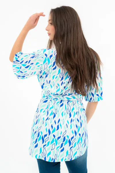 Rövid ujjú női blúz . Enyhén karcsúsított, hosszított fazon . Derekán övvel. Fémcímkével díszítve.