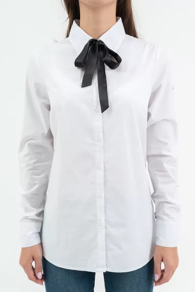 Női blúz rugalmas anyagból. Karcsúsított fazon . Nyakán leszedhető masni dísszel. Hímzésekkel díszítve.