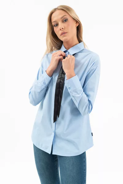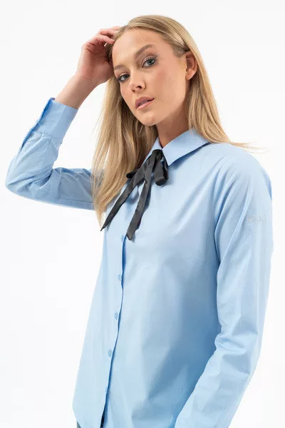Női blúz rugalmas anyagból. Karcsúsított fazon . Nyakán leszedhető masni dísszel. Hímzésekkel díszítve.