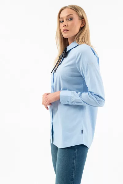 Női blúz rugalmas anyagból. Karcsúsított fazon . Nyakán leszedhető masni dísszel. Hímzésekkel díszítve.