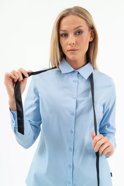 Női blúz rugalmas anyagból. Karcsúsított fazon . Nyakán leszedhető masni dísszel. Hímzésekkel díszítve.