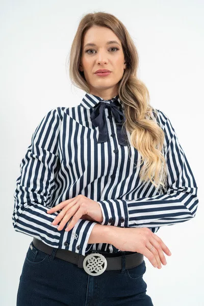 Női blúz rugalmas anyagból. Karcsúsított fazon . Nyakán leszedhető masni dísszel. Hímzésekkel díszítve.
