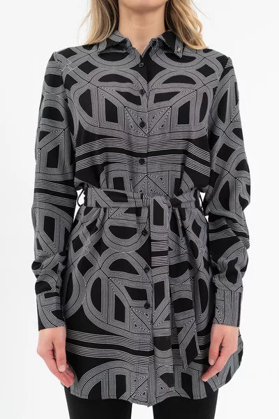 Női hosszított blúz . Lezser fazon . Derekán öv. Fémcímkével díszítve. FIGYELEM! A nagyméretű nyomott minták egyedileg kerülnek rá minden termékre, így az elhelyezkedésük eltérő lehet a fotón látottól!.