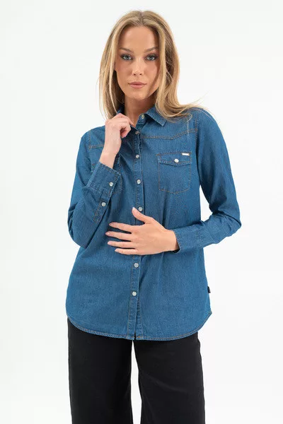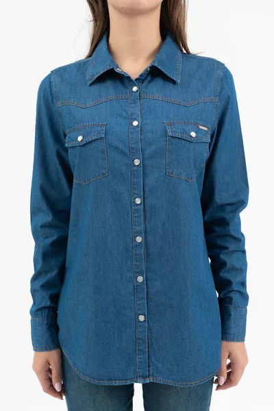 Női blúz vékony farmer anyagból. Karcsúsított fazon. Végig patentos . Fémcímkével díszítve.