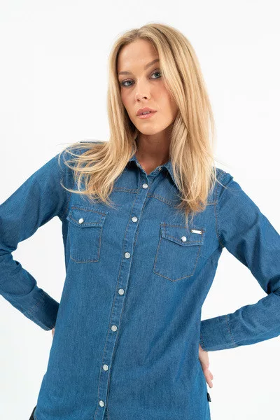 Női blúz vékony farmer anyagból. Karcsúsított fazon. Végig patentos . Fémcímkével díszítve.