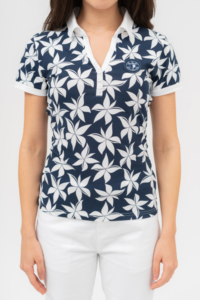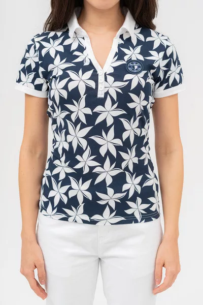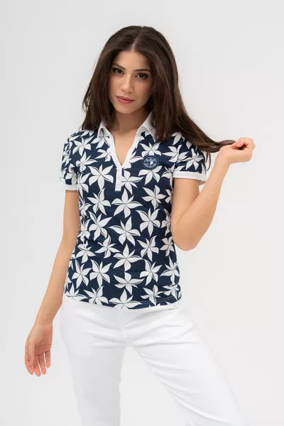 Női galléros póló. Karcsúsított fazon. Szövött címkével díszített.