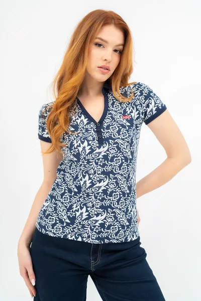 Női galléros póló . Karcsúsított fazon. Hímzett mintával díszített.