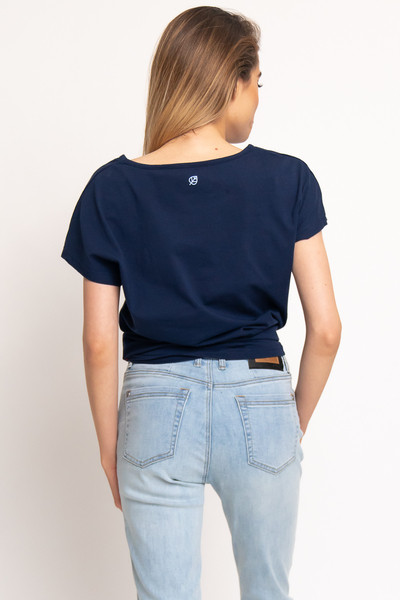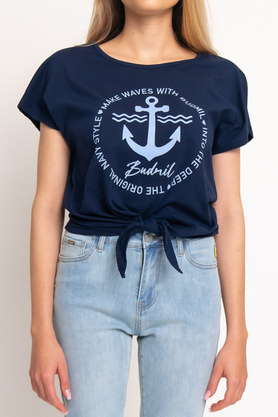 Női póló. Lezser, derékban megköthető fazon. Nyomott mintával díszített.
